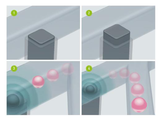 在壓電激活過(guò)程中(圖1和2所示),將產(chǎn)生一個(gè)輕微的壓力波(圖3所示),因此,一小部分鞘液攜帶目的細(xì)胞或顆粒發(fā)生偏轉(zhuǎn)(圖4所示)。只要有細(xì)胞需要進(jìn)行分選,分選過(guò)程中的壓電激活將會(huì)不斷地重復(fù)。整個(gè)分選過(guò)程非常平穩(wěn),而且不存在傳統(tǒng)滴液分選的機(jī)械壓力等問(wèn)題。因此,即使是易碎的細(xì)胞或大顆粒,在被CyFlow®分選機(jī)分選時(shí)不會(huì)在偏轉(zhuǎn)過(guò)程中產(chǎn)生變形和其它外力作用。另外,CyFlow®分選機(jī)的一個(gè)特殊功能是可以在同個(gè)區(qū)域內(nèi)對(duì)所有細(xì)胞進(jìn)行正確分選。此高效率得益于數(shù)據(jù)采集系統(tǒng)幾乎無(wú)空載時(shí)間。整個(gè)儀器硬件和軟件都是實(shí)時(shí)運(yùn)行不被打斷的,所以不會(huì)丟失任何數(shù)據(jù),而這種情況則經(jīng)常發(fā)生在其他現(xiàn)有的分選儀器上。因此 CyFlow®分選機(jī)不會(huì)出現(xiàn)細(xì)胞分選的錯(cuò)誤,保證分選達(dá)到最高純度。