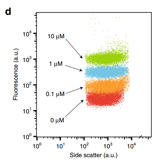 大部分常規(guī)流式細(xì)胞儀的分辨率都在200-500nm之間,無(wú)法分析納米級(jí)生物顆粒,例如細(xì)菌、病毒、亞細(xì)胞器和細(xì)胞外囊泡(EV)等顆粒。在檢測(cè)小顆粒時(shí),側(cè)向角散射光分辨率優(yōu)于前向角散射光,首要原因在于大部分流式細(xì)胞儀的前向角檢測(cè)器使用低靈敏度的二極管,側(cè)向角檢測(cè)器和熒光信號(hào)檢測(cè)器都使用了高靈敏度的光電倍增管(PMT)或雪崩式光電二極管(APD),如果前向角也使用高靈敏度的PMT或APD呢?在檢測(cè)納米顆粒時(shí),SSC的效果還是要比FSC好,原因在于如果檢測(cè)顆粒直徑遠(yuǎn)大于入射光波長(zhǎng),即常規(guī)檢測(cè)細(xì)胞的情形,散射光符合米氏散射規(guī)律(Mie scattering theory),散射光的信號(hào)強(qiáng)度和測(cè)量角度密切相關(guān),前向角的檢測(cè)效率優(yōu)于側(cè)向角,但如果在檢測(cè)納米顆粒時(shí),直徑遠(yuǎn)小于入射光波長(zhǎng),符合瑞利散射規(guī)律,檢測(cè)角度并不是影響散射光效率的因素,側(cè)向角的背景信號(hào)會(huì)遠(yuǎn)低于前向角,所以SSC在檢測(cè)納米顆粒時(shí)分辨率會(huì)比FSC更有優(yōu)勢(shì)。