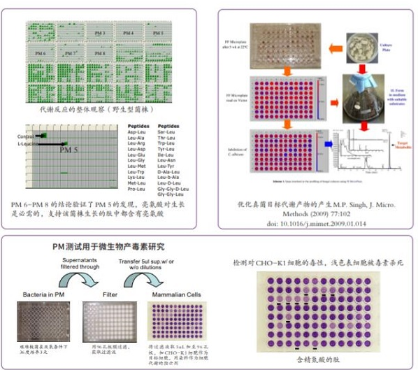 優(yōu)化二級代謝產(chǎn)物生成條件:如抗生素,細(xì)菌、真菌毒素的產(chǎn)生,將PM技術(shù)與抑菌圈法、色譜法,直觀顏色判斷法或活細(xì)胞測試等相結(jié)合,通過快速確定培養(yǎng)后PM板每個微孔中的苗液是否含有相應(yīng)的刺激代謝產(chǎn)物。